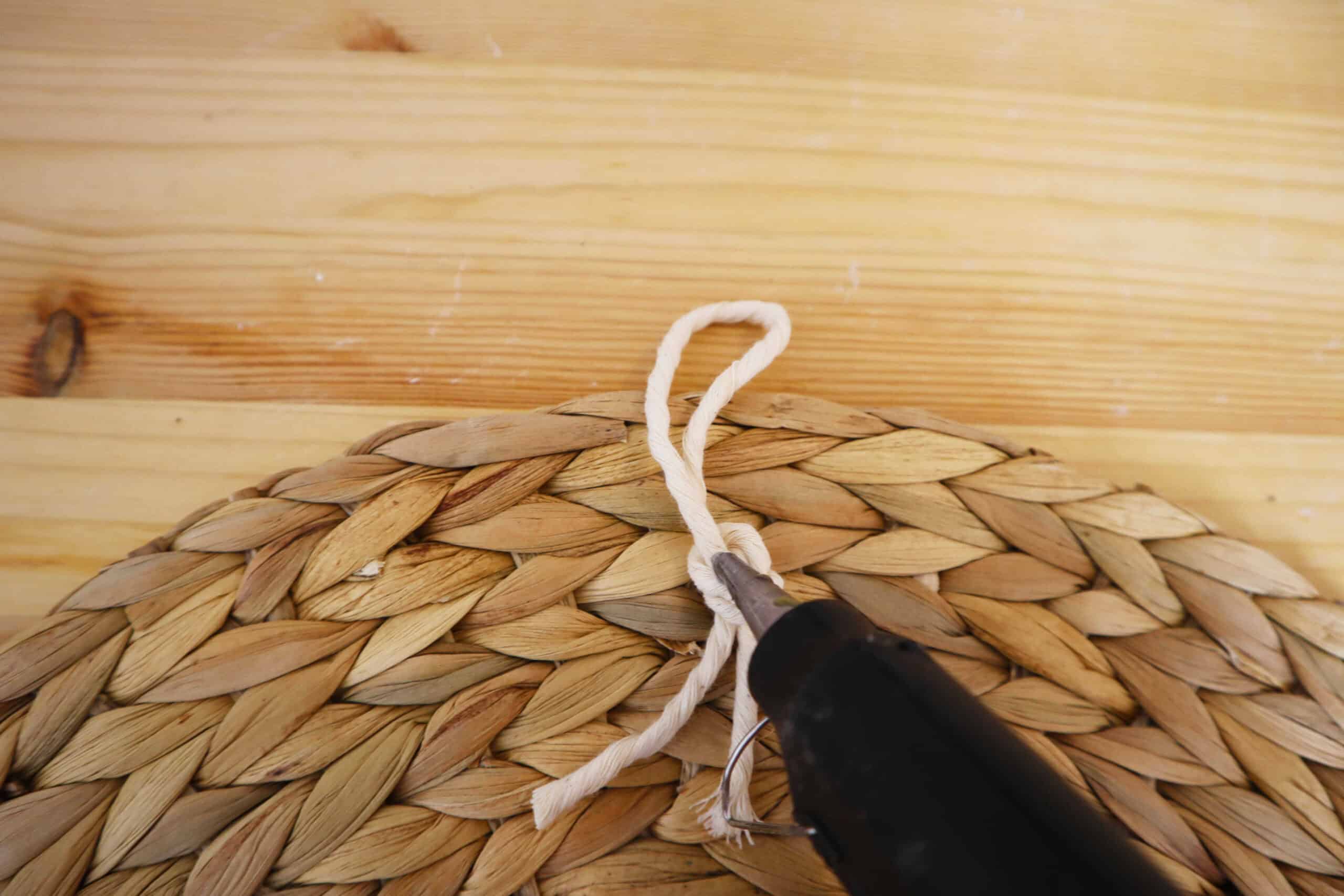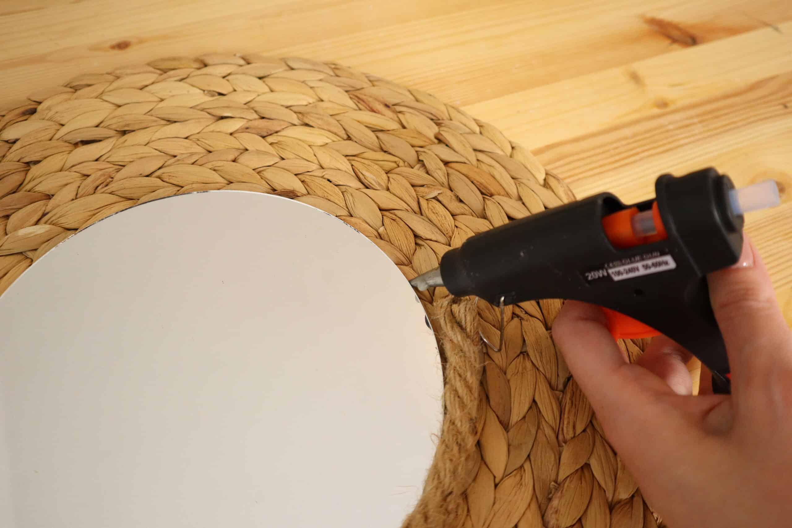 מניחים את חבל היוטה על קו החיבור בין המראה לפלייסמנט ומדביקים מסביב, מקפידים לצור מראה עגול ומדויק. בשלב זה ניתן להוסיף עוד שכבה של חוט יוטה דק או יותר או כל חוט אחר שתבחרו.